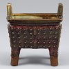 이 향로는 네모난 구연부와 대칭적으로 직립한 사각 귀를 특징으로 하며, 복부의 네 면에는 둥글고 입체적인 고정(鼓钉) 무늬가 빽빽하게 새겨져 있습니다. 고정 무늬는 곡식의 싹이 트는 모습을 형상화한 장식으로, 풍년과 만물의 생기를 상징하는 무늬입니다. 이 무늬에는 풍요로운 곡식과 태평성대를 염원하는 고대인의 간절한 바람이 담겨 있으며 예술적 아름다움뿐만 아니라 역사적, 문화적 상징성도 지니고 있습니다.