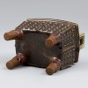 该香炉方形口,两侧对称置方形耳,腹部的四面密密麻麻地雕刻圆形立体的鼓钉纹样。鼓钉纹样形象地表现了谷物萌芽的样子,是象征丰收和万物生机的装饰图案。这些图案蕴含了古人对丰盈谷物和太平盛世的殷切期望,不仅具有艺术美感,也有历史和文化象征意义。