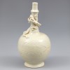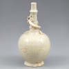 净瓶颈部有轮状出沿,长颈,颈下圆鼓腹,颈上阴刻线纹,规则环绕瓶身。颈肩处堆塑一条螭龙,雕刻工艺精致,龙身缠绕修长的瓶颈,姿态生动,目光向上凝视。螭龙是古代神话传说中的一种龙,象征美好、祥瑞、财富以及爱。