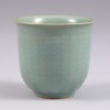 The entire cup is coated with a translucent celadon glaze. The glaze has a soft, matte texture, distinguishing it from more glossy finishes.