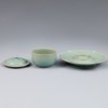이 유물은 북송대(北宋, 960-1127) 여요(汝窯)에서 제작된 뚜껑 있는 잔과 꽃잎 모양 받침대로 구성된 잔탁입니다. 차(茶) 혹은 술(酒)을 담는 제기 용도로 추정되며, 여요 특유의 단정한 기형과 은은한 색조, 표면의 세밀한 균열문(開片)을 모두 갖춘 점에서 기품이 느껴집니다.