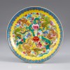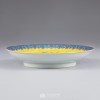 The yellow ground, a color strictly reserved for the emperor and prohibited even to nobles or commoners, underscores the imperial exclusivity of this work. The harmonious interplay of the yellow glaze and the brilliant famille rose enamels places this dish among the highest tier of court wares. The meticulous and refined painting further demonstrates the peak of porcelain craftsmanship during the Qing imperial period. From these details, it is likely that the dish was created as a funerary item or ceremonial ware intended for members of the imperial family or high-ranking nobility.
