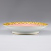 此盘制作于清雍正年间。盘内底华丽描绘龙凤呈祥图案。龙象征皇帝,凤象征皇后,二者同现,寓意皇室的和谐、繁荣与太平盛世。盘内底以篆体书写黄色“寿”字,象征长寿。其四周环绕着彩色云纹,簇拥着龙与凤,共同构成吉祥的图案组合。其中,“寿”字代表长寿,龙凤寓意和合,云纹象征祥瑞与兴盛。外圈的黄色连云纹是清代皇家瓷器的典型纹饰。