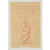 화면은 황색의 얇은 종이 위에 붉은 주사(朱沙) 선묘(線描)로 나한을 묘사하고 있습니다. 상단에는 불경 일부가 정갈하게 적혀 있습니다. 이 작품은 상하구성을 유지하면서도 나한의 자세, 표정, 그리고 경문의 조합을 달리하며 하나하나가 독립적인 불화이기도 합니다.