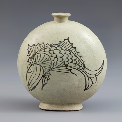 52 분청 보성 덤벙 철화 어문 편병 조선전기 | 21.5×4×10 cm