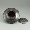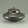 This is a black earthen vessel characterized by a cover, the body of the vessel bulging outwards, and the bottom foot narrower than the mouth.