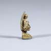 佛像结跏趺坐,右手高举至胸前,结施无畏印。头部背后饰有简化火焰纹样的三角形光背,强化了佛的神圣性与权威感。通肩式僧衣自双肩披下,流畅的衣纹自然垂落至膝下,增强了立体感与视觉美感。