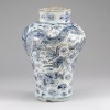 발톱이 네 개인 사조룡은 왕실의 문양으로 권위와 영험함을 상징합니다. 배경에는 영지형(靈芝形)과 만(卍)자형 운문이 여백 없이 시문되어 번영, 길상의 의미를 더합니다. 청화 안료로 그려진 문양은 선묘가 정교하고 생동감이 뛰어나 당대 장인의 솜씨를 잘 보여줍니다.