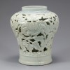 This jar, produced in the 18th century at the Bunwon kiln in Gwangju, Korea, is a fine example of a white porcelain blue-and-white reticulated vessel from the Joseon Dynasty. It features a straight, upright rim, a broad shoulder that flares outwards, and a body that gradually narrows toward the base. The structure consists of two layers, an inner and an outer jar fitted together as one form.