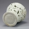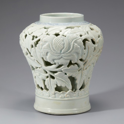 The outer wall is decorated with a peony scroll design carved in openwork (reticulation) while the clay was still wet. A band of blue-and-white scroll motifs encircles the shoulder, and raised ruyi-head patterns and double incised lines appear below the waist. In symbolic meaning, peony represents wealth and prosperity, the scroll motif expresses vitality and continuity, and the ruyi pattern signifies fulfillment and auspicious wishes.