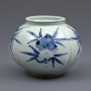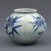 구연과 굽의 지름이 비슷한 소형 항아리입니다. 구연은 짧게 직립하고 중앙에서 최대 복경을 이루며 전체적으로 팽만한 형태입니다. 동체의 사방에 세로줄의 골이 있어 모양새가 감과 같아 감항아리라고도 부릅니다. 각 세로줄 사이로 자손 번창과 다산을 기원하는 문양인 석류를 탐스럽게 청화 안료로 시문하였습니다. 구연부 둘레에는 청화로 한 줄의 띠를 돌렸습니다. 굽바닥에는 모래 받침 흔적이 남아있습니다.
