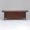 This particular desk has slightly upturned ends on the top board to prevent objects from slipping off. The long drawer is ideal for storing writing tools such as brushes, inkstones, and paper. At the center is a circular metal lockplate, while ring-shaped handles are attached on both sides. Metal fittings at the corners add both strength and elegance.