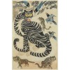 The composition—four magpies on a pine tree at the top, the mother tiger with a cub on her back in the center, and two additional cubs at the bottom—is a stylized characteristic of late Joseon Dynasty Hojakdo. This specific iconographic arrangement appears in Hojakdo painted by the 19th-century artist Sin Jae-hyeon. Given the similarity in composition, it is possible that this artifact was produced using Sin Jae-hyeon's work as a model.